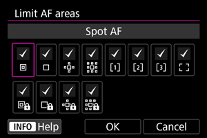 You can limit the AF areas available to the areas that you normally use. Select available AF areas and press SET to add a checkmark [Check]. Select [OK] to register the setting. For details on AF areas, see AF Area.