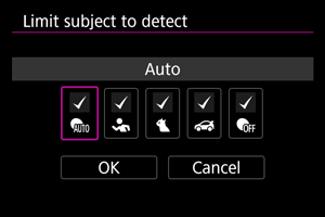 You can limit the available setting options in [Autofocus: Subject to detect] to your preferred options. Select an option to exclude and press SET to clear [Check]. Select [OK] to register the setting.