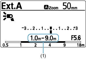- Kun painat kameran laukaisimen puoliväliin, salaman käyttöetäisyys (1) tulee näkyviin.