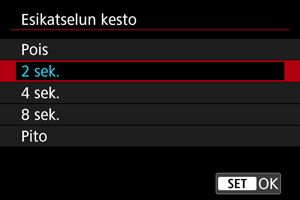 - [Etsimen näyttö] ‑asetus on voimassa, kun [Esikatselun kesto] ‑asetuksen arvo on jokin muu kuin [Pois].