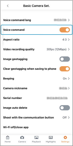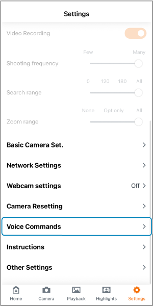 - Puhekomentojen kieli ei vaihdu, jos älypuhelimen kieliasetus vaihdetaan sovelluksen käynnistämisen jälkeen. Voit vaihtaa puhekomentokielen muuttamalla [Voice command lang/Puhekomentokieli] -asetusta kohdassa [Basic Camera Set./Kameran perusasetukset].