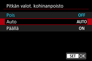 Kohinanpoisto tehdään aina, kun valotusaika on vähintään 1 sekunti. [Päällä]-asetus saattaa vähentää kohinaa, jota [Auto]-asetus ei tunnista.