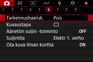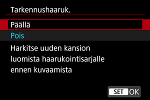 : Tarkennushaaruk.] palautuu arvoon [Pois], kun virtakytkin asetetaan asentoon
