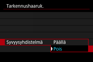- Valitse [Pois], jos et halua kompensoida kuvan kirkkauden muutoksia tarkennushaarukoinnin aikana. Voit käyttää tätä asetusta muuhun kuin otettujen kuvien syväterävyyden säätöön DPP:n tapaisissa sovelluksissa.