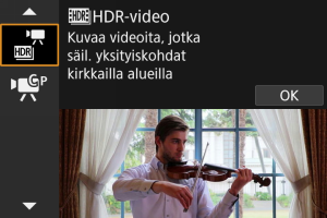 Voit kuvata suuren dynaamisen alueen videoita, joissa suuren kontrastin huippuvalojen yksityiskohdat säilyvät.