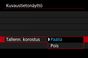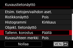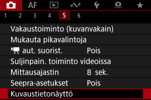 - Lisätietoja seuraavista aiheista on kohdassa Kuvaustietojen näyttö aiheessa Stillkuvien kuvaus.