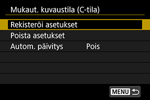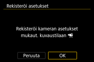 - Nykyiset kameran asetukset rekisteröidään mukautettuun kuvaustilaan.