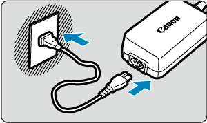 - Jos latauksen merkkivalo ei syty tai latauksen aikana ilmenee ongelma (tämän näkee käyttövalon vilkkumisesta vihreänä), irrota virtajohto, aseta akku uudelleen paikalleen ja odota muutama minuutti, ennen kuin kytket virtajohdon uudelleen. Jos ongelma ei poistu, vie kamera lähimpään Canon-huoltoon.