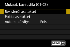 - Joissakin valikkokohdissa muissa kuvaustiloissa määritetyt asetukset eivät ehkä siirry Mukautetun kuvaustilan asetuksiin.