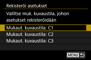 - Nykyiset kameran asetukset tallennetaan mukautettuun kuvaustilaan C*.