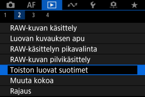 - RAW-kuvia ei voi valita. Huomaa, että RAW+JPEG-kuvauksessa otetuissa kuvissa suodatus tehdään JPEG-kuvaan ennen tulosten tallentamista.