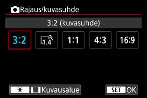 Kuvasuhdetta voi muuttaa ennen kuvausta. Voit kuvata asetuksella [1,4x (rajaus)] aivan kuin teleobjektiivia käytettäessä, koska tämä vaihtoehto suurentaa kuvan keskiosaa.