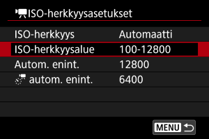 Voit määrittää manuaalisen ISO-herkkyyden asetusalueen (Pienin/Suurin).