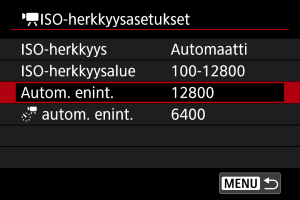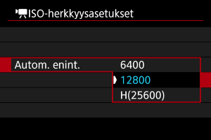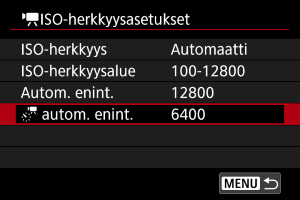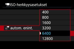 ] automaattisen ISO-herkkyyden avulla. Oletusarvoisesti enimmäisraja on ISO6400. Enimmäisrajan voi asettaa arvoon ISO 400–12800.