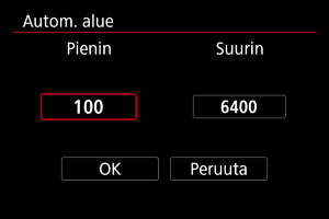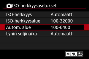 Automaattiselle ISO-herkkyydelle ([AUTO]) voi määrittää ISO-herkkyyden enimmäisarvon.