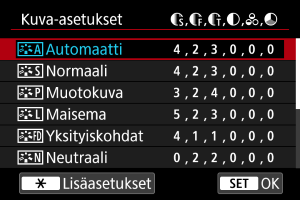 Voit lisätä uusia asetuksia esimääritettyjen, kuten [Muotokuva] tai [Maisema] tai kuva-asetustiedosto, perusteella ja säätää sitten sitä tarpeen mukaan (). Kun otat kuvia tyylillä, jota et ole vielä mukauttanut, niillä on samat ominaisuudet kuin oletusarvoisella [Automaatti]-asetuksella.