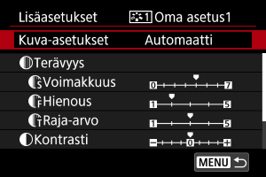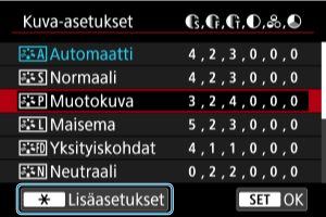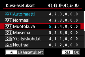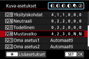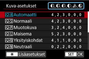 - Jos kuva-asetus on jo tallennettu kohtaan [Oma asetus*], peruskuva-asetusten muuttaminen poistaa aiemmin tallennettujen käyttäjän määrittämien kuva-asetusten parametrien asetukset.