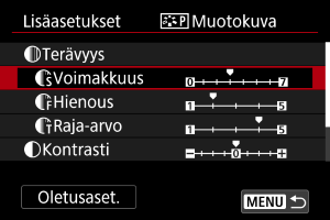 - Videokuvauksessa ”*, *” näkyy [Hienous]- ja [Raja-arvo]-parametreissä kohdassa [Terävyys]. [Hienous] ja [Raja-arvo] eivät ole käytettävissä videokuvauksessa.