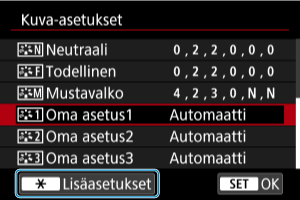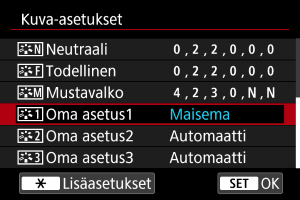- Sininen kuva-asetuksen nimi kohdassa [Oma asetus*] tarkoittaa, että sitä on muutettu oletusasetuksista.