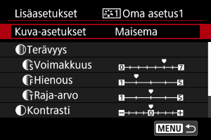 Voit valita jonkin peruskuva-asetuksen, kuten [Muotokuva] tai [Maisema], säätää sen parametrejä ja tallentaa sen kohtaan [Oma asetus1]–[Oma asetus3]. Tämä on hyödyllistä, kun luot useita kuva-asetuksia, joilla on erilaiset asetukset.