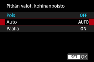 Kohinanpoisto tehdään aina, kun valotusaika on vähintään 1 sekunti. [Päällä]-asetus saattaa vähentää kohinaa, jota [Auto]-asetus ei tunnista.