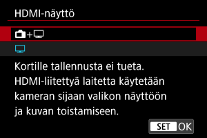 Poistaa kameran näytön käytöstä, kun käytetään HDMI-lähtöä, joten näyttö on tyhjä.