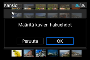 Voit suodattaa kuvien näytön hakuehtojen mukaan. Kun olet asettanut hakuehdot, voit toistaa ja näyttää vain löydetyt kuvat. Voit myös suojata, luokitella, toistaa kuvaesityksen, poistaa ja käyttää muita toimintoja suodatuille kuville.