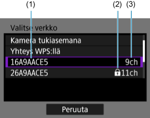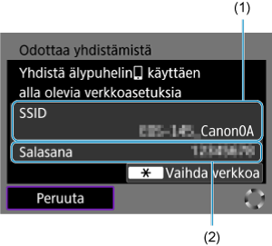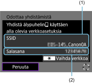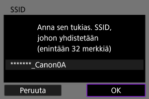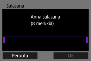 - Valitse toisen laitteen Wi-Fi-asetuksissa kameran näytössä näkyvä SSID (verkon nimi) ja kirjoita sitten salasana.