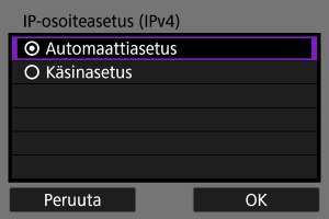 - Jos valitsit vaihtoehdon [Ei mitään], [IP-osoiteasetus (IPv4)] ‑näyttö tulee näkyviin ().