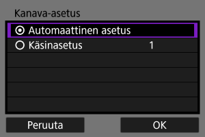 Kamera tukiasemana ‑tilan verkkoasetukset määritetään manuaalisesti. Aseta [SSID], [Kanava-asetus] ja [Salausasetukset] kullakin näytetyllä näytöllä.