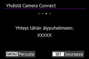 - Jos Camera Connect ‑sovellusta ei ole asennettu, skannaa näytöllä oleva QR-koodi älypuhelimella, siirry Google Play- tai App Store ‑kauppaan asentamaan Camera Connect ja aloita yhteensovitus painamalla sitten