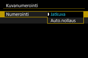 Kansioon tallennetuille otetuille kuville määritetään tiedostonumero väliltä 0001 ja 9999. Voit muuttaa kuvatiedostojen numerointitavan.