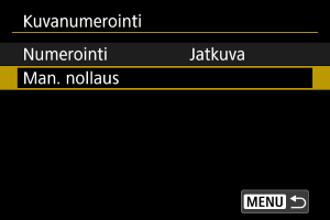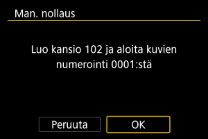 Kun nollaat kuvanumeroinnin manuaalisesti, uusi kansio luodaan automaattisesti ja siihen tallennettujen kuvien numerointi alkaa numerosta 0001.