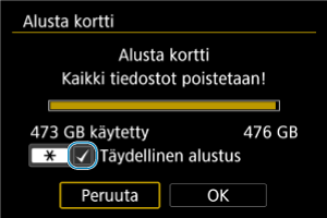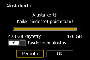 - Täydellisen alustuksen voi peruuttaa sen aikana valitsemalla [Peruuta]. Tässäkin tapauksessa tavallinen alustus on suoritettu, ja voit käyttää korttia normaalisti.