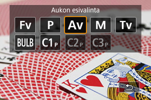 Tässä tilassa voit määrittää haluamasi aukkoarvon, ja kamera määrittää valotusajan automaattisesti, jotta normaali valotus olisi kohteen kirkkauteen sopiva. Suurempi f/-luku (pienempi aukko) suurentaa sopivan tarkennuksen aluetta etualalla ja taustalla. Toisaalta matalampi f/-luku (suurempi aukko) pienentää sopivan tarkennuksen aluetta etualalla ja taustalla.