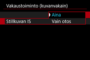 - [Vakaustoiminto (kuvanvakain)] ei ole käytettävissä, kun käytetään objektiiveja, joissa on IS-kytkin. Käytä sen sijaan objektiivin IS-kytkintä.