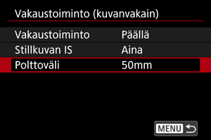 Määritettyyn objektiivin polttoväliin perustuva kuvanvakaus on mahdollinen, kun polttoväli määritetään niille objektiiveille, jotka eivät tue objektiivin tiedonsiirtoa.