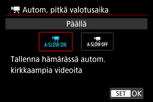 Voit valita, kuvaatko videoita, jotka ovat vaaleampia ja joissa on vähemmän kohinaa kuin asetuksella [Pois], pidentämällä valotusaikaa automaattisesti heikossa valaistuksessa.