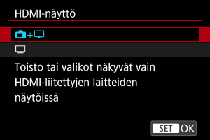 Poistaa kameran näytön käytöstä, kun käytetään HDMI-lähtöä, joten näyttö on tyhjä.