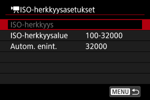 ]-tilassa voit määrittää ISO-herkkyyden manuaalisesti. Voit valita asetukseksi myös automaattisen ISO-herkkyyden.
