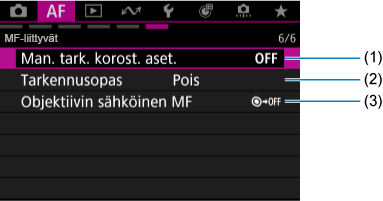 - Kun käytetään objektiivia, jossa ei ole tarkennustavan valintakytkintä [Tarkennustapa] näkyy [