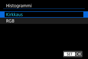 Histogrammit näyttävät signaalitasot sävyalueella. Kirkkauden näyttö (yleisen valotustason ja sävyntoiston tarkistamiseen) ja RGB-näyttö (värikylläisyyden ja punaisen, vihreän ja sinisen sävyntoiston tarkistamiseen) ovat käytettävissä. Voit vaihtaa näytettävän histogrammin painamalla -painiketta, kun [