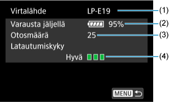 - (3) Nykyisellä akulla otettujen kuvien määrä. Numero nollautuu, kun akku ladataan.