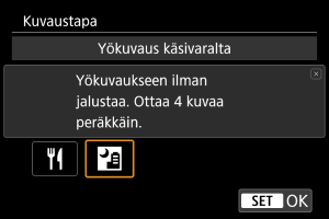Pidä kyynärpäät lähellä kehoa, jotta kamera ei liiku (). Tässä tilassa neljä kuvaa kohdistetaan ja yhdistetään yhdeksi kuvaksi, mutta jos näiden neljän otoksen kohdistukset vaihtelevat liikaa esimerkiksi kameran tärähdysten vuoksi, otoksia ei ehkä pystytä kohdistamaan oikein lopullisessa kuvassa.