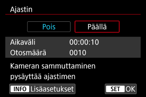 Ajastinkuvauksessa voit asettaa kuvausvälin ja kuvien määrän, niin että kamera ottaa yksittäisiä kuvia toistuvasti kuvausvälin mukaan, kunnes määrittämäsi määrä kuvia on otettu.