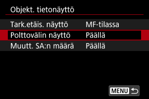 Voit näyttää tarkennusetäisyyden käytettäessä RF-objektiivia. Tarkennusetäisyyden näytössä voit valita ajan ja mittayksikön.