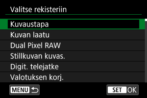 [Valikkonäyttö]-asetuksella voit valita sen valikkonäytön, joka tulee ensin näkyviin, kun painat -painiketta.