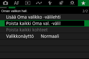 Voit poistaa kaikki luomasi Oma valikko ‑välilehdet. Kun valitset [Poista kaikki Oma val. ‑välil], kaikki välilehdet [MY MENU1]–[MY MENU5] poistetaan ja []-välilehti palautetaan oletusasetuksiinsa.