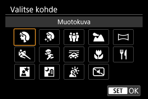 -toiminnossa valitse kuvaustila napauttamalla kuvaketta näytön vasemmassa yläkulmassa tai [Valitse kohde]-näytöstä kohdassa [