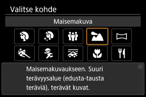 Käytä [] (Maisemakuva), kun kuvaat laajoja maisemakuvia ja haluat tarkentaa koko kuva-alan läheltä kauas. Eloisat sinisen ja vihreän sävyt, terävät ja tarkat kuvat.